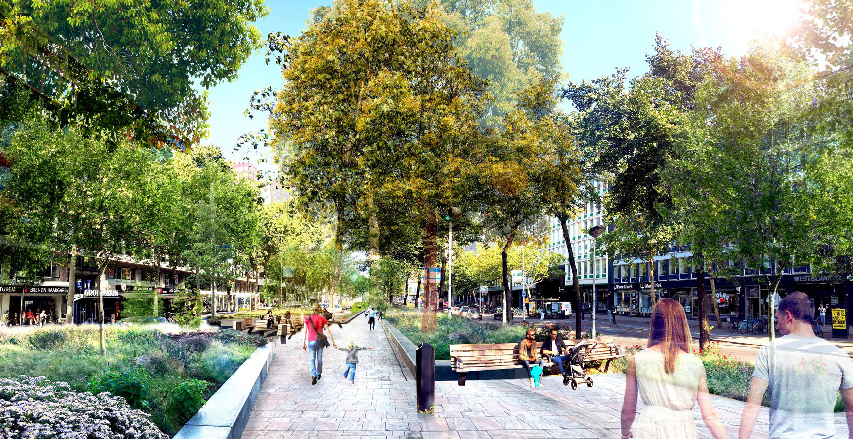 Greenlung Hofplein and Westblaak: Hofplein, with its fountain, is an iconographic place in Rotterdam. The new plan for the square focuses on a more balanced traffic model, transforming the central area with its fountain into a large, green recreational square. The Westblaak is part of the boulevard structure of the city centre. Reducing the number of lanes for cars creates a lot of space for cyclists, pedestrians, other forms of mobility and recreation. With a greener avenue, there will also be more shade and cooler spots. The transition of the boulevards will result in cleaner air and less noise.