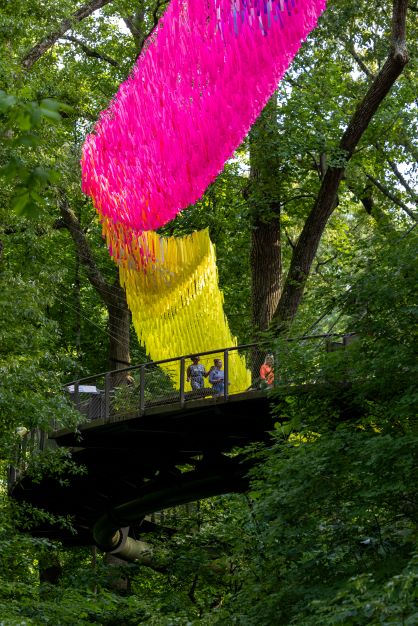 “Dream Flora,” on display through September 19, is composed of red, orange, purple and yellow nylon streamers attached to webs of nylon fishing net that are suspended by ropes in the trees of the Southern Seasons Garden. The installation then extends to the Canopy Walk, where it flows above, under and beside the suspension bridge, crossing the entry road at two points and gliding through the air like a flock of birds. The 12,500-square-foot skynet ranges in width from five to 25 feet and in height from 12 to 40 feet. The design creates a fanciful, almost lyrical, expression that, with its brilliant colors, explores the all-green tree canopy, leading guests to experience Storza Woods in a fresh, unexpected way.