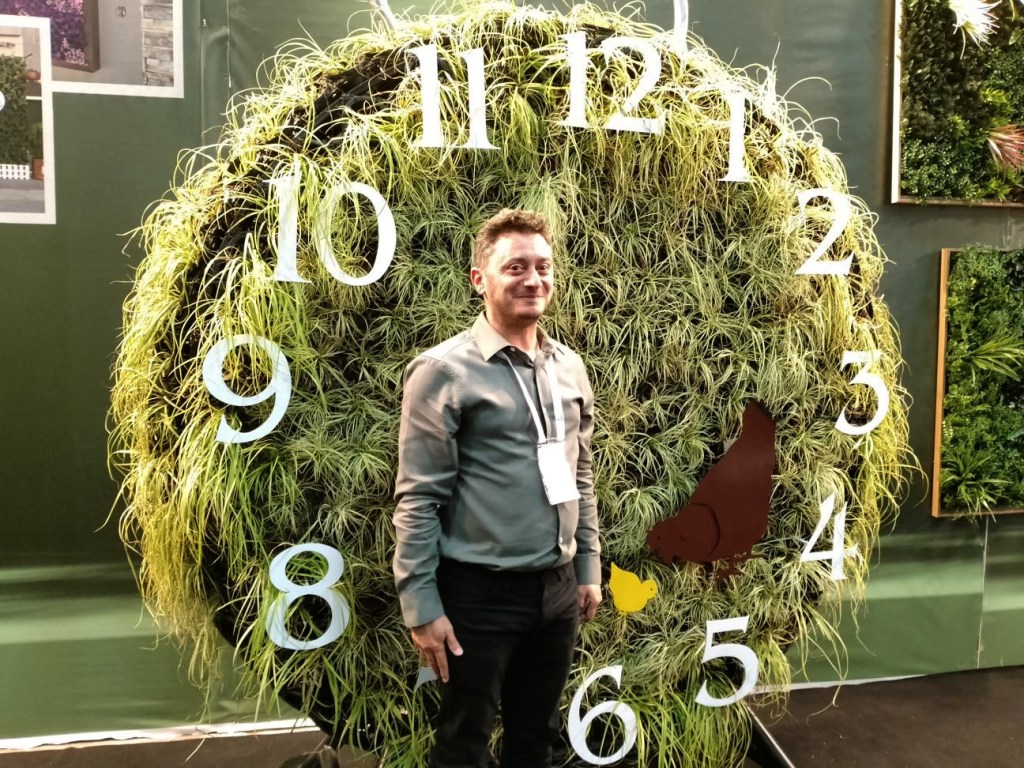 The Verticalle company attracted attention with its spatial decorations made of plants, which are its hallmark. The clock made of variegated sedges, which was the central point of the exhibition, is an example of such a decoration. At the request of customers as municipalities or even Expo gardens, Verticalle builds, according to its own patent Modular Pot System, plant decorations, green walls, arches or balls, with a watering system included.