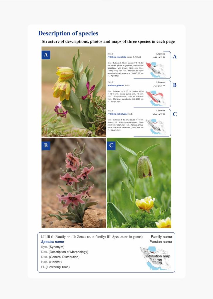 The morphology of each species is briefly described. Moreover, general distribution, habitat types, flowering time and a map showing the distribution range inside of Iran for each species are presented. All photos have been taken in the wild and in natural habitats.