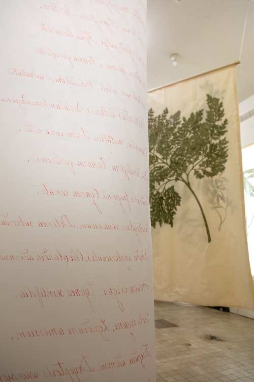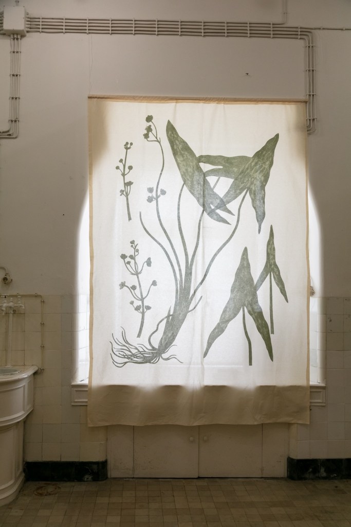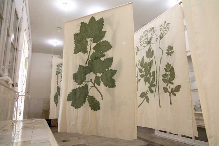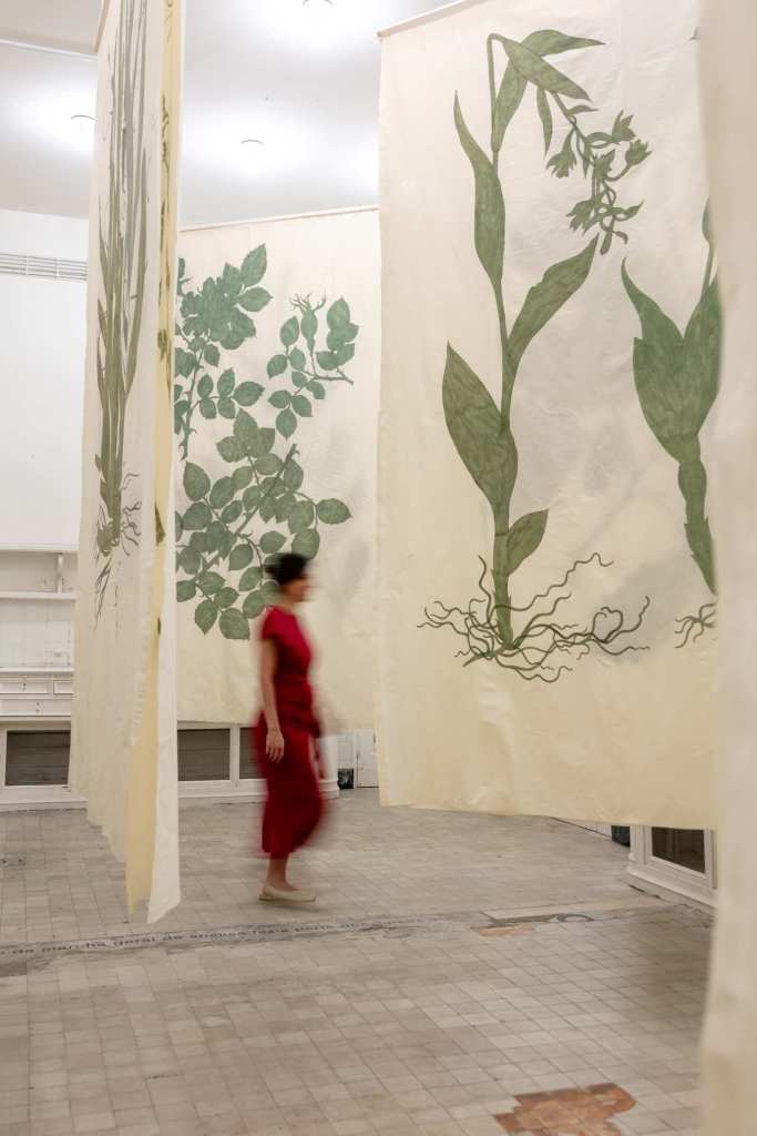 At the core of Rosa’s project lies an exploration of memory as both a biological and cultural archive. Her large-scale paintings on organic textiles, depicting plant silhouettes magnified beyond human proportions, evoke the format of traditional herbaria while subverting their original function. Historically conceived as instruments of taxonomy and preservation, herbarium sheets once guaranteed a species’ permanence within human knowledge even as its presence in the wild diminished. Rosa radicalises this logic: her monumental renderings transform documentary function into existential lament, foregrounding the tension between representation and disappearance.