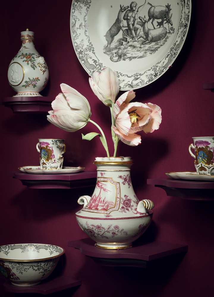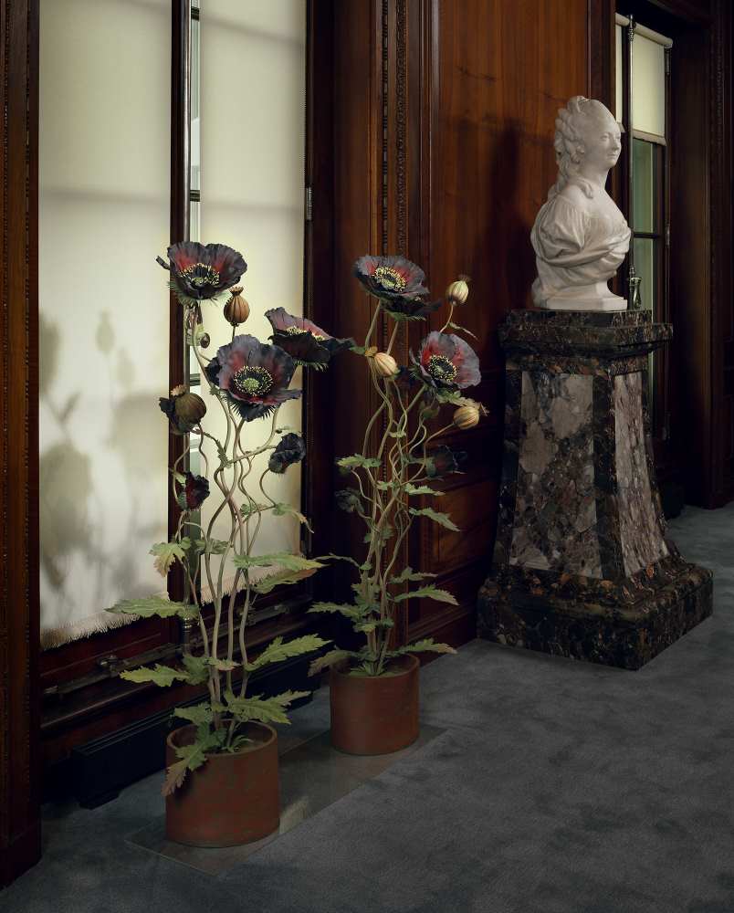 The museum’s newly accessible second floor adds further depth to the installation. In the Walnut Room, Henry Clay Frick’s former bedroom, porcelain black poppies mark both a tribute and a meditation on mortality, commemorating the collector’s legacy in the very room where he died in 1919. Nearby, porcelain tulips appear in a rare tulip-shaped Du Paquier vase from 1725, reinforcing the dialogue between Kanevsky’s modern creations and The Frick’s historical treasures.