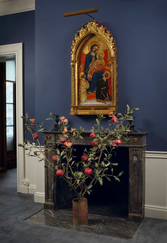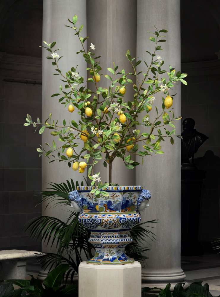 At The Frick, the artist both recalls and reinvents Helen Clay Frick’s original arrangements. In two cases, the camellias in the Library and lilies of the valley in the Boucher Room, he directly reprises her selections. Elsewhere, he builds fresh dialogues between flora and art. A porcelain pomegranate tree in the Gold-Grounds Room references the fruit’s symbolic role in Italian Renaissance painting, while a wild artichoke under Bellini’s St. Francis in the Desert evokes the rugged landscape of the saint’s retreat. In the Garden Court, Kanevsky’s lemon tree grows from an eighteenth-century French faience planter once designed to display living citrus.