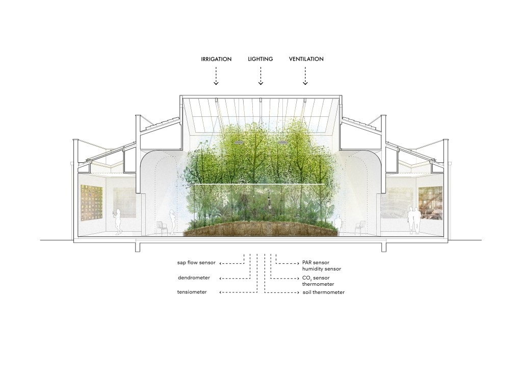 The pavilion’s main hall will house more than 200 plants beneath its skylight, creating a self-regulating microclimate. Using advanced monitoring systems, the behaviour of these plants, such as their hydration needs and responses to light, will be tracked in real time. This data will then be used to trigger irrigation, lighting, and ventilation, establishing a feedback loop where the needs of plants, humans, and buildings converge. As Smets explains, the aim is to test “the possibility for plants to actively produce and control a building’s indoor climate,” opening the door to architecture as a living microclimate shared by humans and non-humans alike.