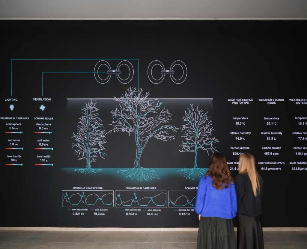 The Belgian Pavilion, built in 1907 and the oldest national pavilion in the Giardini, has been reimagined for the occasion. Its side rooms provide historical context and showcase experiments by a new generation of Belgian architects, while the back room displays live data from the functioning prototype. Four young architectural teams, Elmēs, Maud Gerard Goossens and Henri Uijtterhaegen, and Panta, Lisa Mandelartz Schenk and Steven Schenk, have been invited to expand on the curators’ ideas, speculating on future architectural forms driven by natural intelligence.