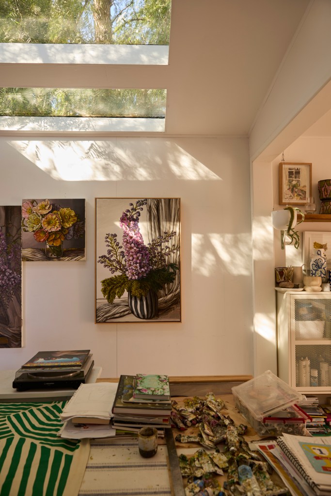 A full-time oil painter, Michelle works from her beautiful studio in Blind Bight, on the coast of Victoria. Her practice is grounded in still life, where she builds layered compositions and quiet narratives using her ever-growing collection of ceramics and textiles. Vessels, patterned fabrics, and carefully chosen objects become staging points for gesture and mood, allowing each painting to unfold as both image and story.