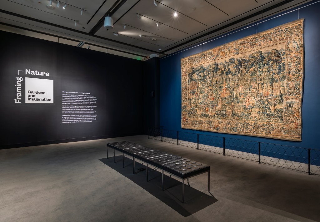 Organized thematically, the exhibition unfolds as a series of interconnected narratives and opens with an important and striking tapestry: a monumental Flemish work depicting an idealized park scene. Woven in wool and silk, this rarely displayed piece immediately sets the tone for the exhibition, immersing visitors in a lush, imagined landscape filled with human activity: music, leisure, and cultivation, while highlighting the historical significance of gardens as curated, symbolic environments.