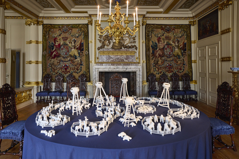 The exhibition challenges traditional museological approaches by dispersing artworks throughout the estate. In Queen Mary’s Cellar Kitchen, Antye Guenther’s Salt of Interest cultivates salt crystals directly on historic tiles, transforming conservation damage into a poetic reflection on climate instability and material decay. In the former royal dining room and chapel, Bryony Dunne’s Tables of Power stages intricate sugar sculptures that recall courtly display traditions while exposing the violence embedded in colonial extraction systems.